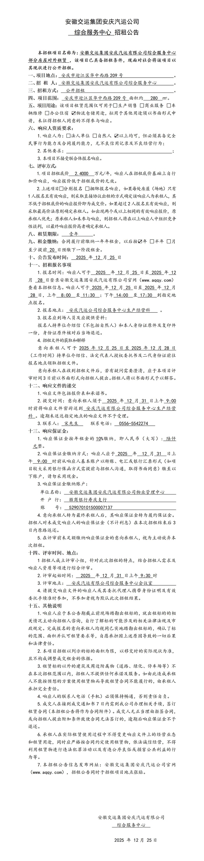 綜合服務中心招租公告