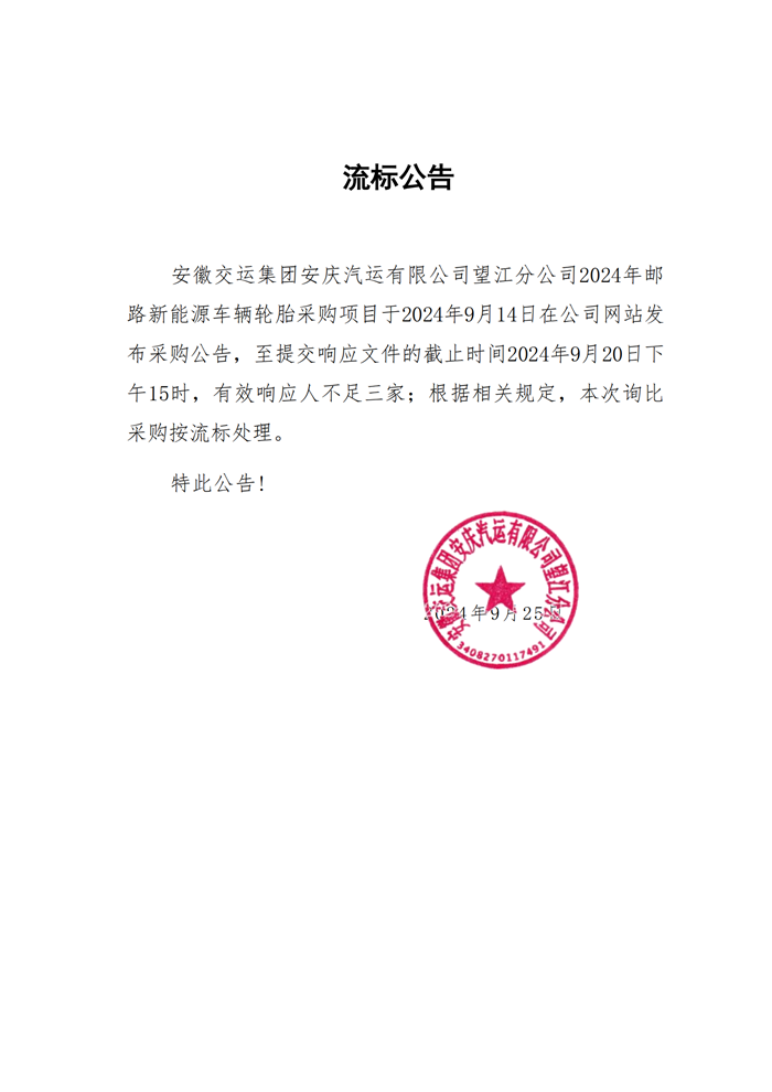 望江分公司郵路新能源車(chē)輛輪胎采購(gòu)流標(biāo)公告